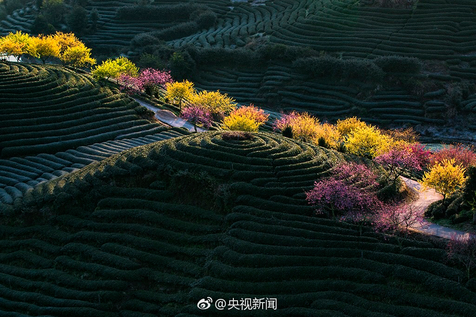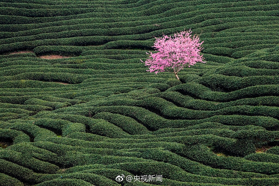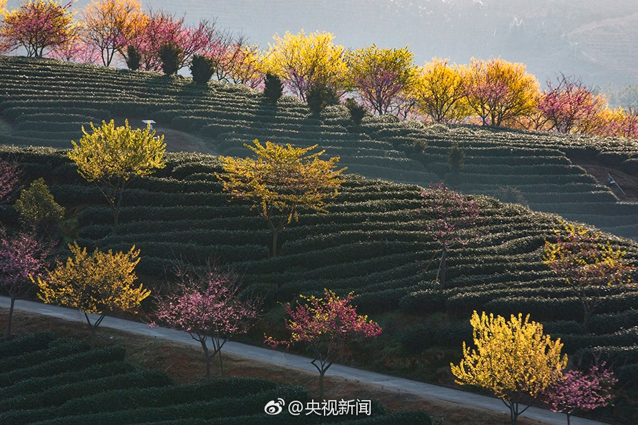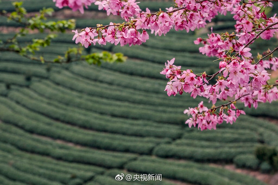 Bello paisaje de flores de cerezo en jardín de té en Fujian